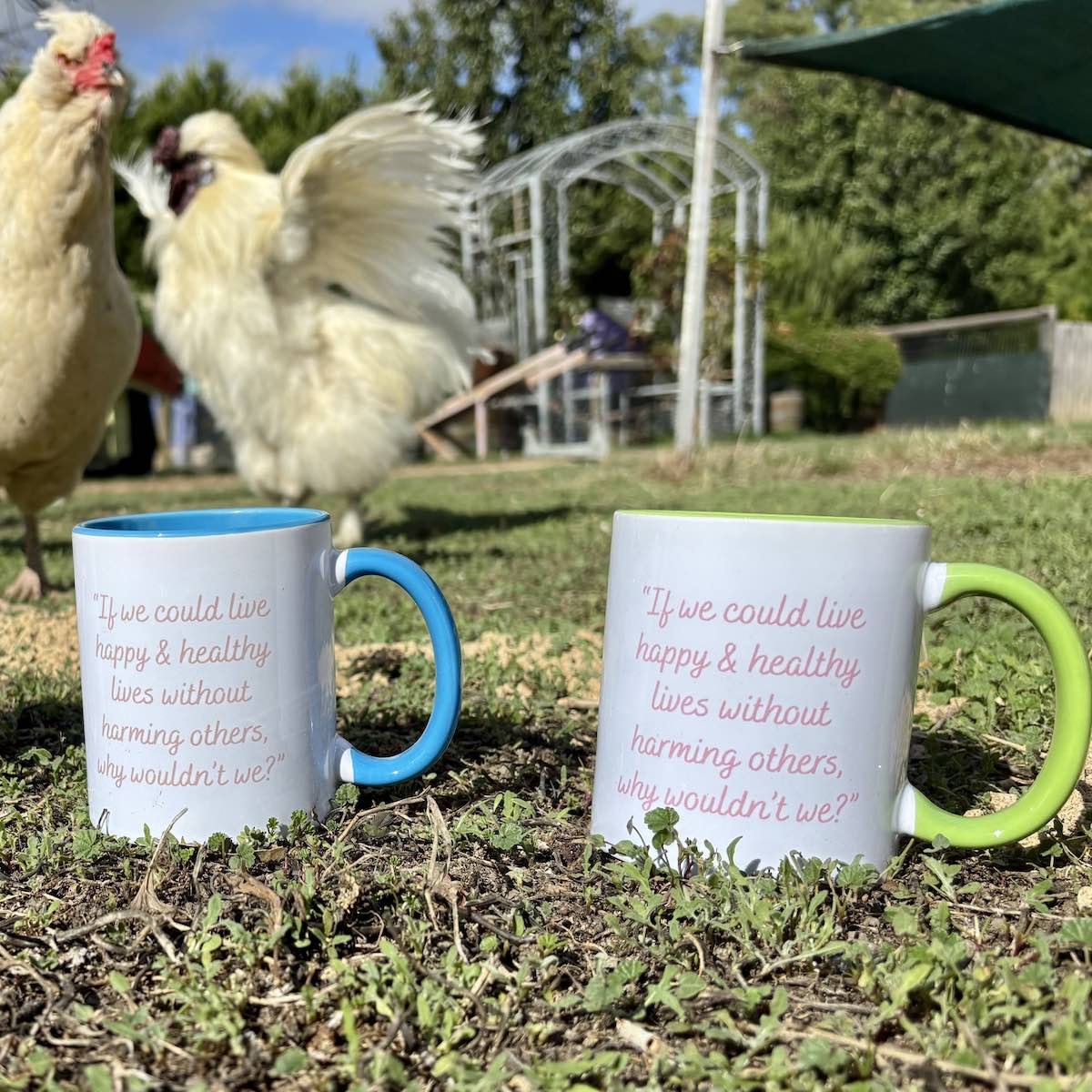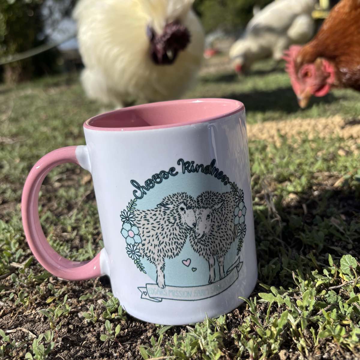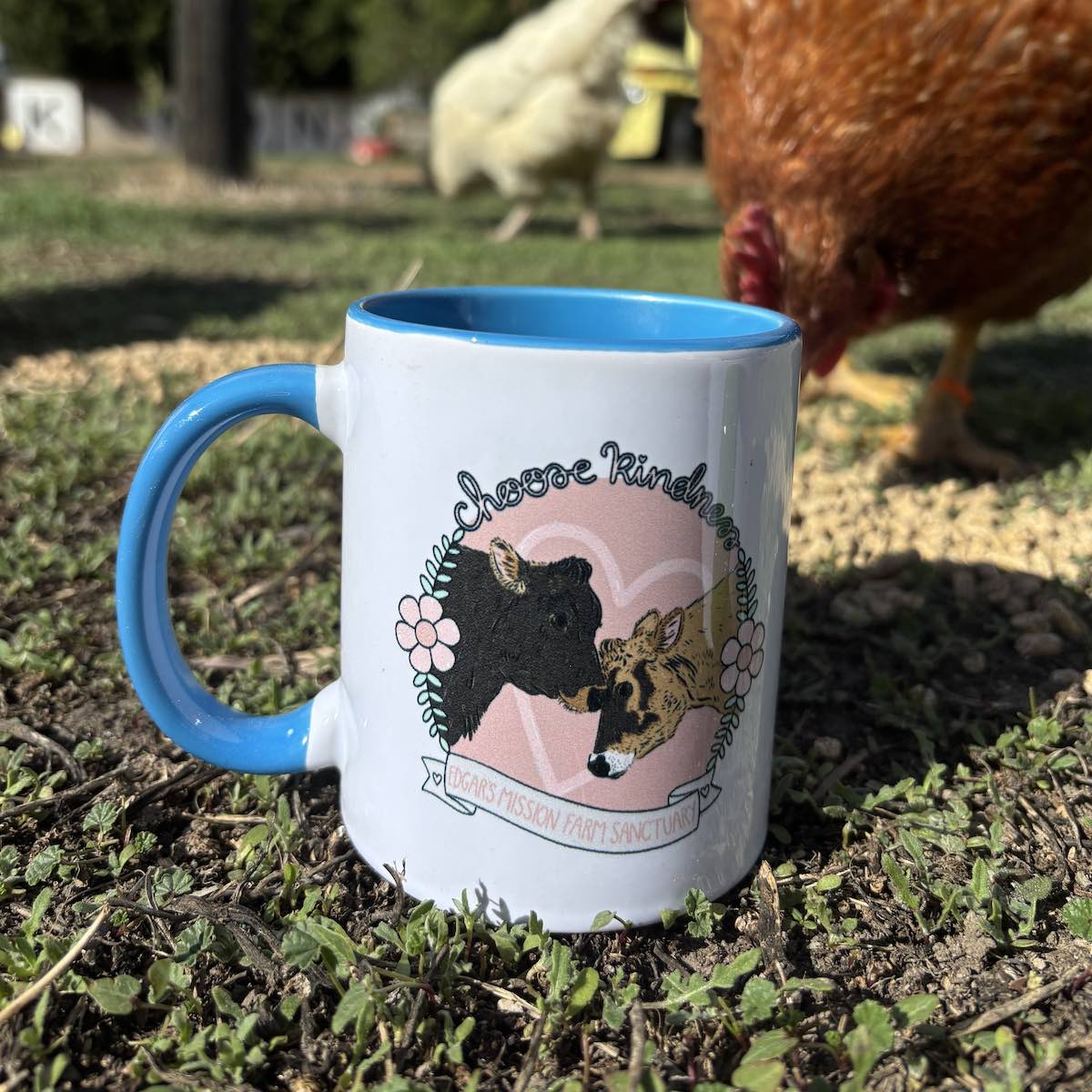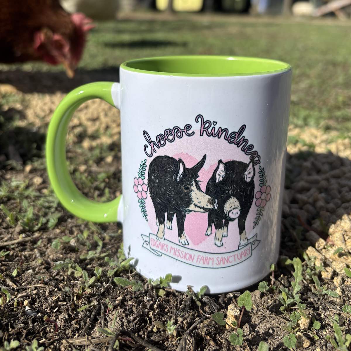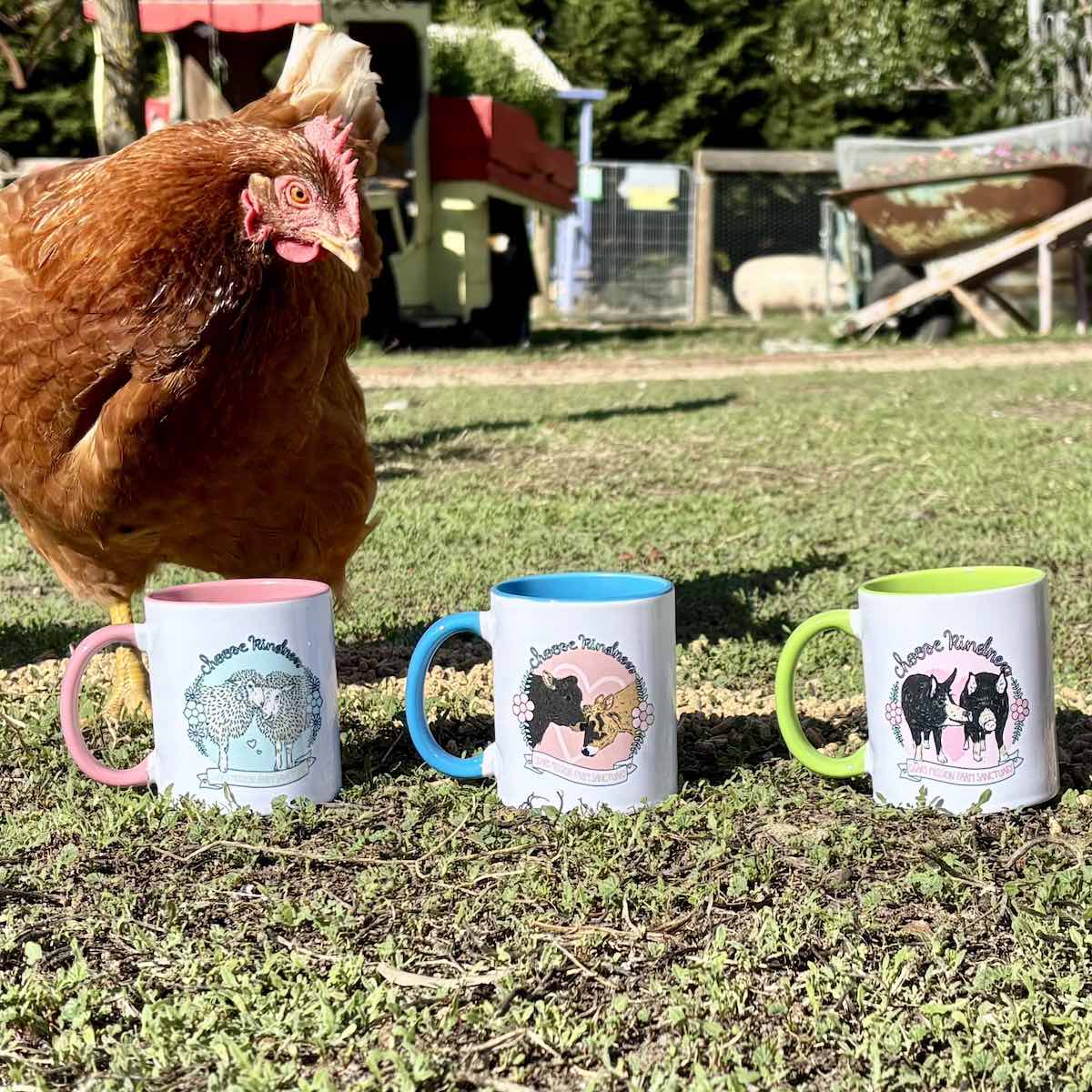 Enjoy your favourite brew in our Choose Kindness mugs, presented in a natural gift box. Three beautiful designs featuring Edgar’s Mission residents. Choose from our cow design featuring Valentine and Clarabelle (blue), our pig design starring Carol and Candy (green) or our sheep design with Ray Ray and Lambini (pink).